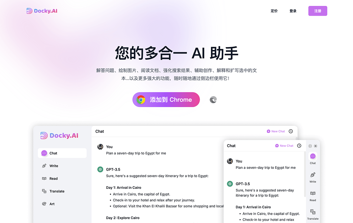 Docky.ai 是一款可以解答问题、绘制图片、阅读文档、强化搜索结果、辅助创作、解释和扩写选中的文本的智能浏览器插件,Docky AI 目前支持GPT3.5和GPT4-o等多款模型,可以随时随地在浏览器侧边栏使用它!