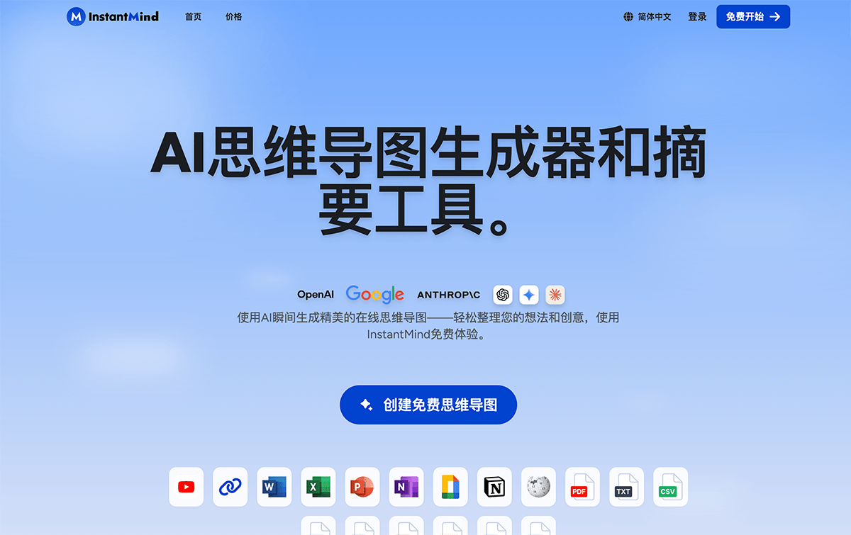 InstantMind是一款革命性的AI思维导图生成器和文档摘要工具,致力于帮助用户快速整理思路、提升工作效率。InstantMind最大的亮点是支持超过30种文件格式的智能转换,无论是PDF、Word、Excel、PowerPoint文档,还是电子书、Markdown文件,甚至视频、网页内容和图片,都能瞬间转换为结构清晰、视觉精美的思维导图。无论是学生整理学习资料,职场人士制作工作汇报,还是创业者梳理商业思路,InstantMind都是理想的效率提升工具。