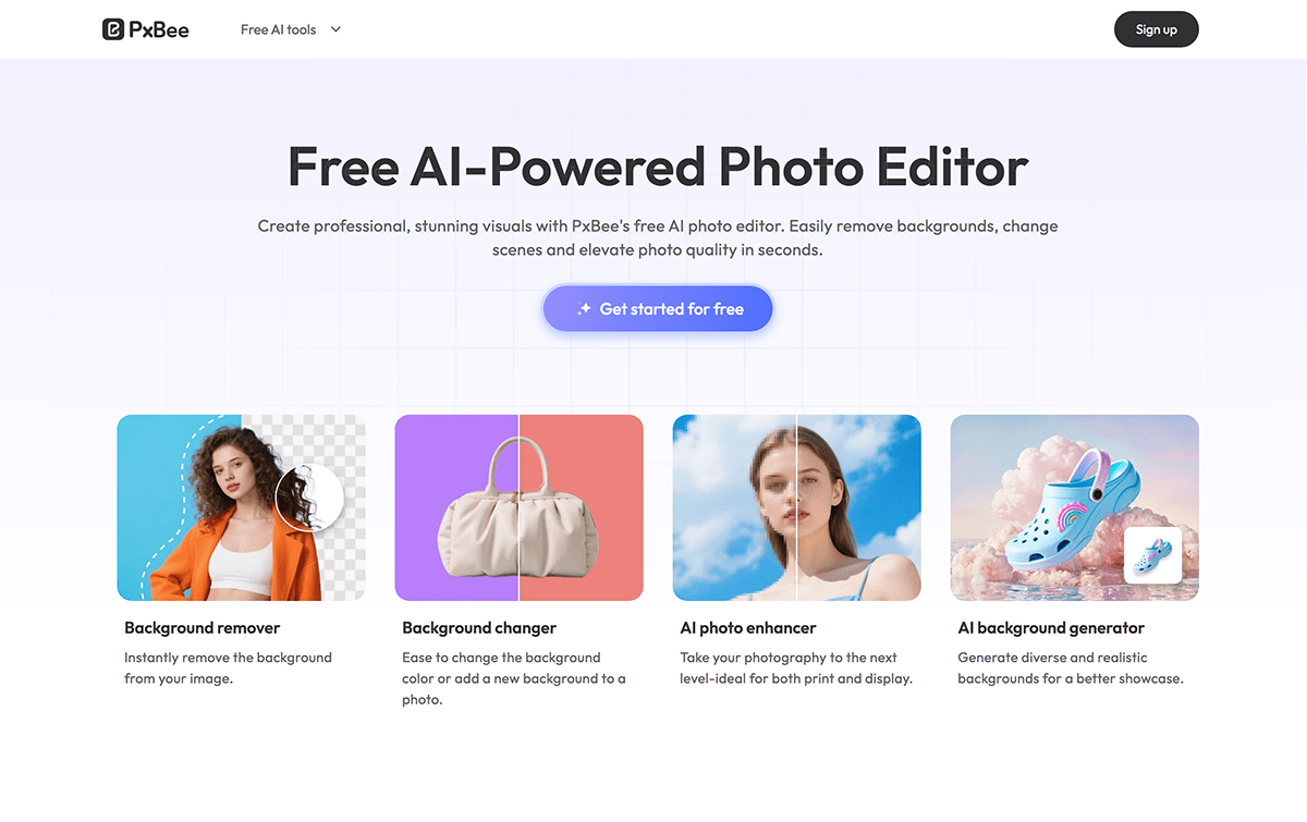 PxBee是一个免费的AI图像处理平台,由知名图像编辑平台Fotor打造。PxBee为用户提供多种AI照片编辑和处理工具,包括背景移除、图像增强、背景更换、智能擦除、图像扩展、水印去除等多种AI工具。使用 PxBee免费的AI照片编辑器,创作专业、惊艳的视觉效果。轻松移除背景、切换场景,并在几秒钟内提升照片质量。