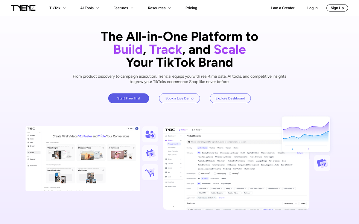 - Trenz 将商品、店铺、达人、视频、广告及直播数据整合至清晰易懂的仪表盘。
