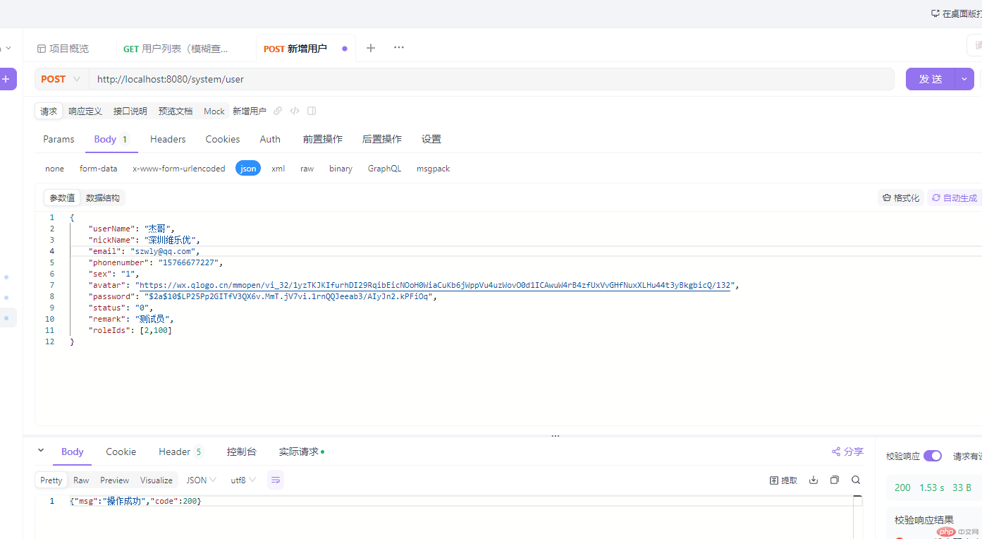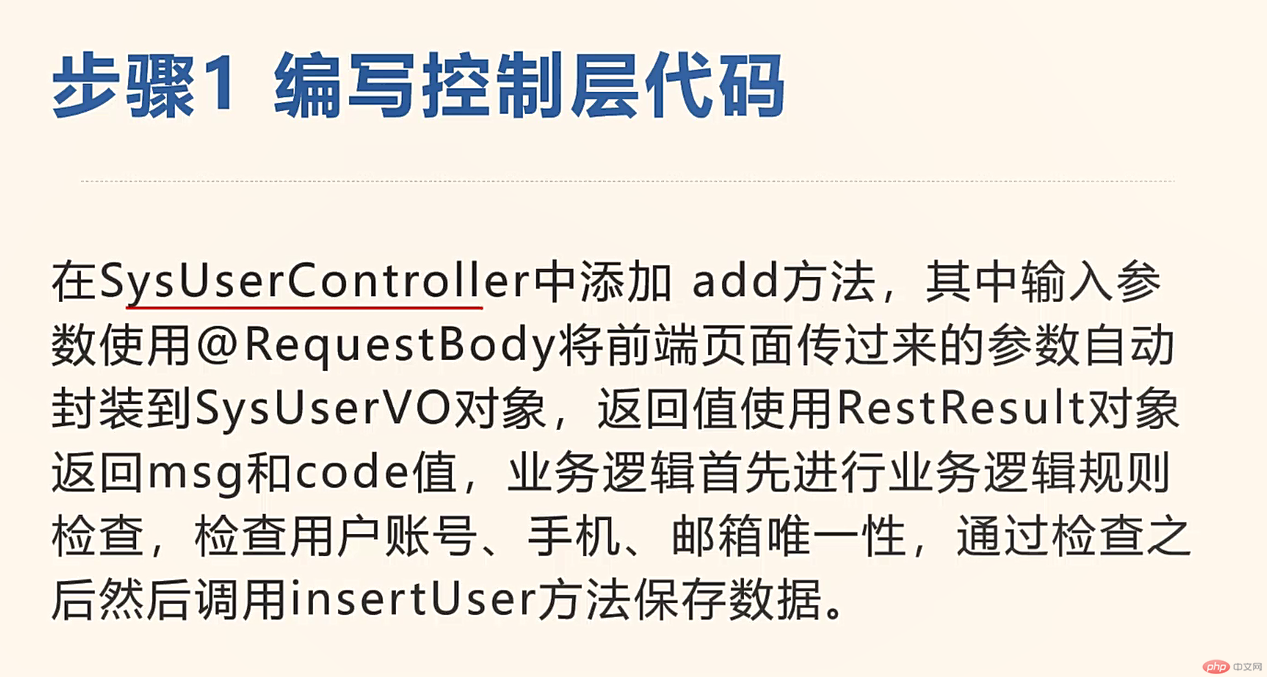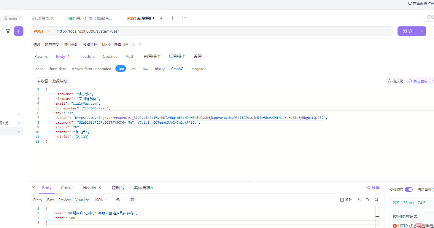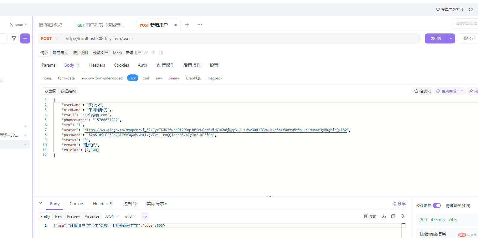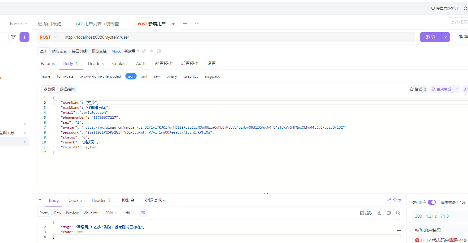 /*** 新增用户* */@PostMappingpublic RestResult add(@RequestBody SysUserVo user){if(UserConstants.NOT_UNIQUE.equals(sysUserService.checkUserNameUnique(user.getUserName()))){return RestResult.error("新增用户'"+user.getUserName()+"'失败,登录账号已存在");} else if(UserConstants.NOT_UNIQUE.equals(sysUserService.checkPhoneUnique(user))){return RestResult.error("新增用户'"+user.getUserName()+"'失败,手机号码已存在");} else if(UserConstants.NOT_UNIQUE.equals(sysUserService.checkEmailUnique(user))){return RestResult.error("新增用户'"+user.getUserName()+"'失败,邮箱账号已存在");}user.setCreateBy("system");boolean flag = sysUserService.insertUser(user);return toAjax(flag?1:0);//extends BaseController}