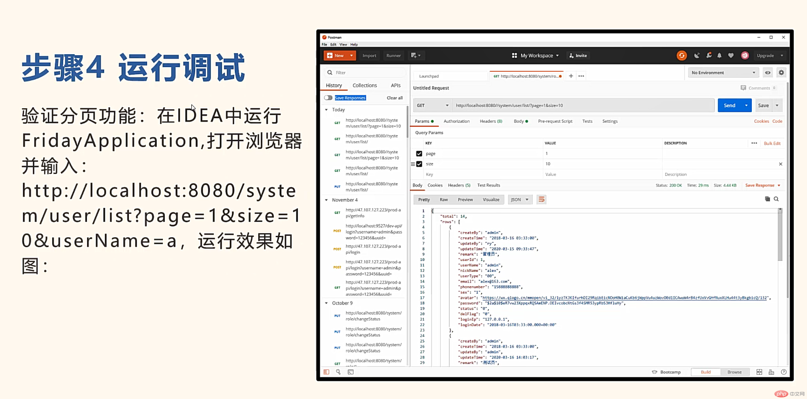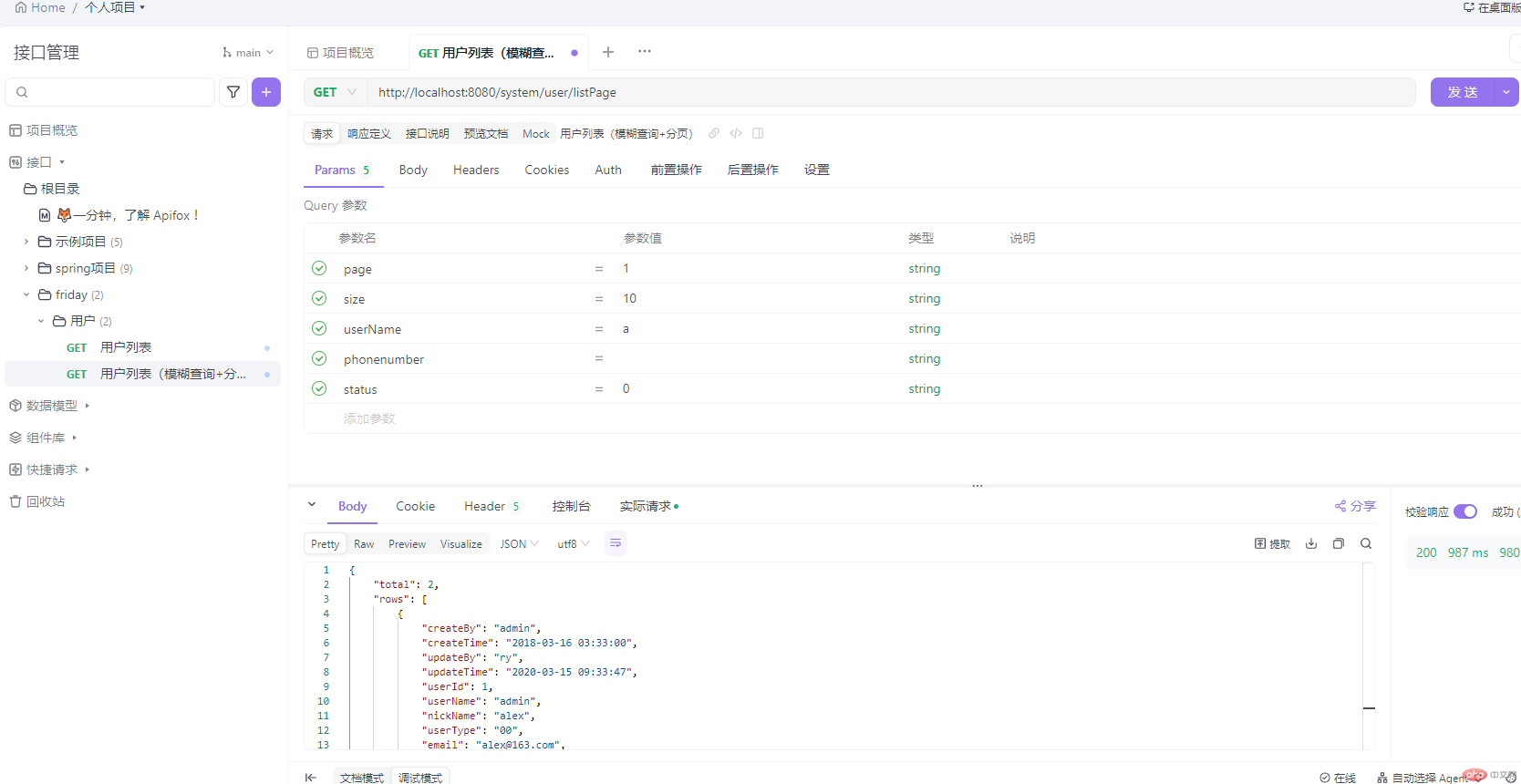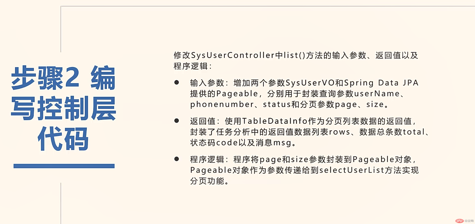 /*** 用户列表(模糊查询username,phonenumber/分页)* */@GetMapping("/listPage")public TableDataInfo list2(SysUserVo user, Pageable page){int pageNum = page.getPageNumber() - 1;pageNum = Math.max(0, pageNum);page = PageRequest.of(pageNum,page.getPageSize());return sysUserService.selectUserList2(user, page);}