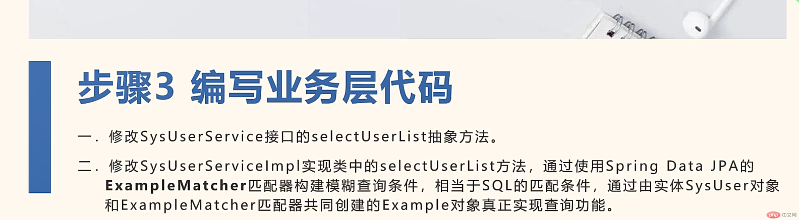 /*** 用户表 业务层* */@Servicepublic class SysUserServiceImpl implements SysUserService {@AutowiredSysUserRepository sysUserRepository;/*** 显示所有用户列表* */@Overridepublic List<SysUser> selectUserList() {return sysUserRepository.findAll();}/*** 用户列表(模糊查询 + 分页)* */@Overridepublic TableDataInfo selectUserList2(SysUserVo user, Pageable page) {SysUser sysUser = new SysUser();BeanUtils.copyPropertiesIgnoreEmpty(user, sysUser);// sysUser.setDelFlag("0");ExampleMatcher exampleMatcher = ExampleMatcher.matching().withMatcher("userName",ExampleMatcher.GenericPropertyMatchers.contains()).withMatcher("phonenumber",ExampleMatcher.GenericPropertyMatchers.contains()).withMatcher("status",ExampleMatcher.GenericPropertyMatchers.contains());Example<SysUser> example = Example.of(sysUser,exampleMatcher);Page<SysUser> rs = sysUserRepository.findAll(example,page);return TableDataInfo.success(rs.toList(),rs.getTotalElements());}}