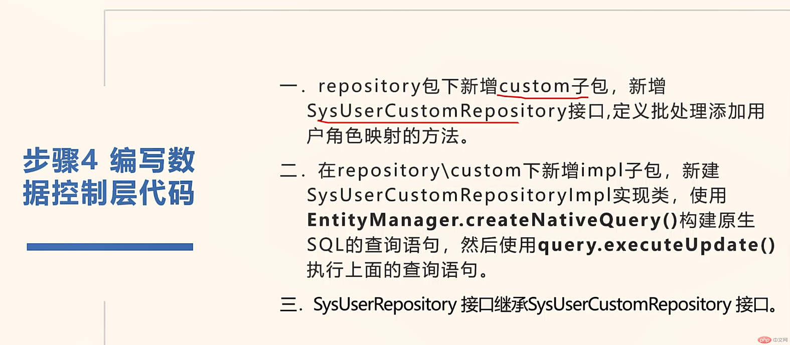 public class SysUserCustomRepositoryImpl implements SysUserCustomRepository {// 用于与持久性上下文(数据库)进行交互。// 更为特定于JPA,通常在JPA或Hibernate等ORM框架的应用中使用。@PersistenceContextprivate EntityManager entityManager;@Overridepublic int batchInsertUserRole(Long[] userIds, Long[] roles) {int length = Math.min(userIds.length,roles.length);StringBuffer sql = new StringBuffer();sql.append(" insert into sys_user_role(user_id, role_id) values ");sql.append(SqlUtil.getBatchInsertSqlStr(length,2));Query query = entityManager.createNativeQuery(sql.toString());int paramIndex = 1;for (int i = 0; i < length; i++) {query.setParameter(paramIndex++,userIds[i]);query.setParameter(paramIndex++,roles[i]);}return query.executeUpdate();}}
