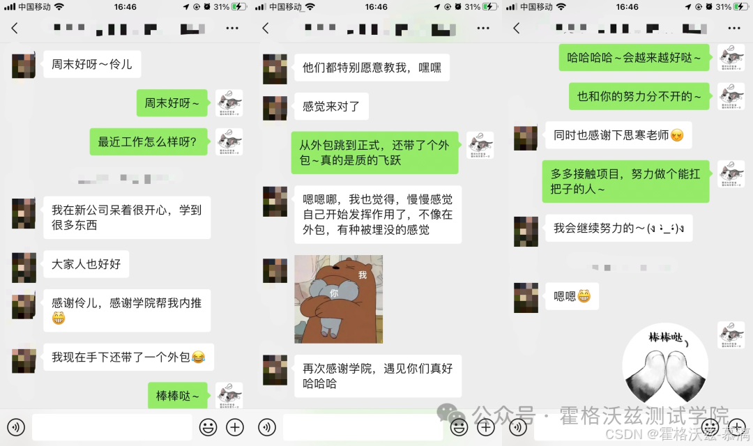 - 他说: 在新公司呆的非常开心,喜欢身边的同事,非常有归属感,感觉自己时刻都在发光发热。感谢学社内推,遇见你们真好,让我感觉自己开始在发挥作用,不像在外包有种被埋没的感觉。