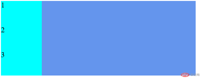 <!DOCTYPE html><html lang="en"><head><meta charset="UTF-8" /><meta name="viewport" content="width=device-width, initial-scale=1.0" /><title>Document</title></head><style>.flex-content {width: 620px;display: flex;background-color: cornflowerblue;}.flex-item {width: 130px;height: 80px;background-color: cyan;font-size: 1.5rem;}</style><body><div class="flex-content"><div class="flex-item">1</div><div class="flex-item">2</div><div class="flex-item">3</div></div></body></html>