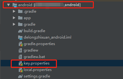 在 android 目录下创建 key.properties 并配置 storePassword(密匙库密码)、keyPassword(密匙密码)、keyAlias(别名)、storeFile(jks文件地址)