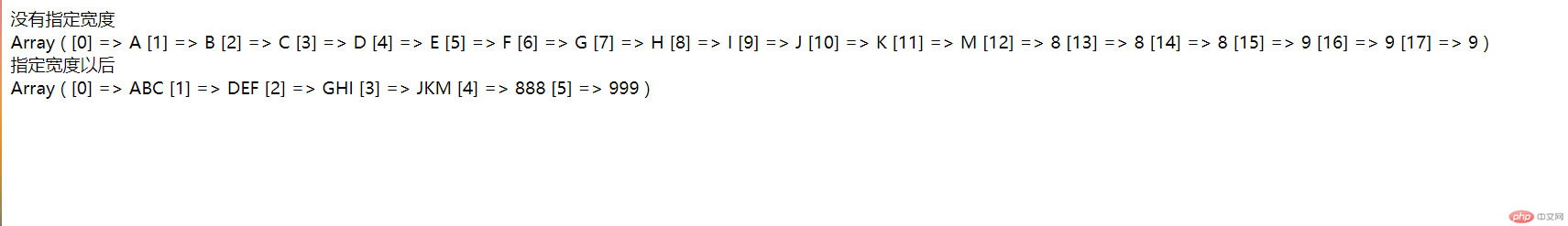 $str = "ABCDEFGHIJKM888999";// 没有指定宽度echo "没有指定宽度"."<br>";print_r (str_split($str));echo "<br>";// 指定宽度以后echo "指定宽度以后"."<br>";print_r(str_split($str,3));