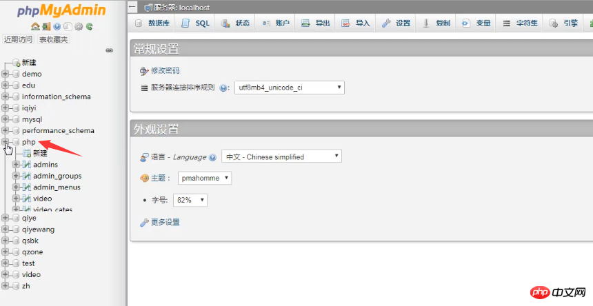 这里我们先登录phpmyadmin看看是否存在php数据库,从下图可以知道是存在php这个数据库的。
