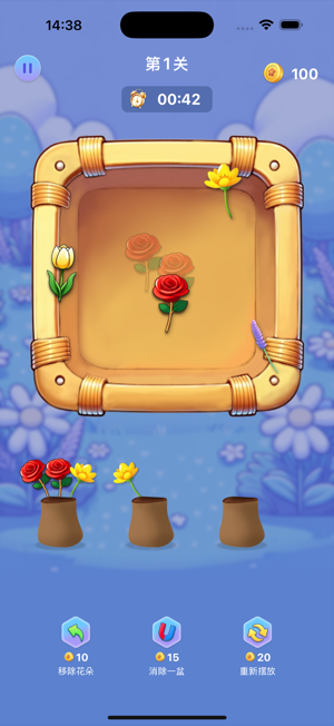 趣味玩法:点击花篮中的花朵,将它们摆放到花瓶上,三个相同花朵即可消除,简单上手又充满策略!