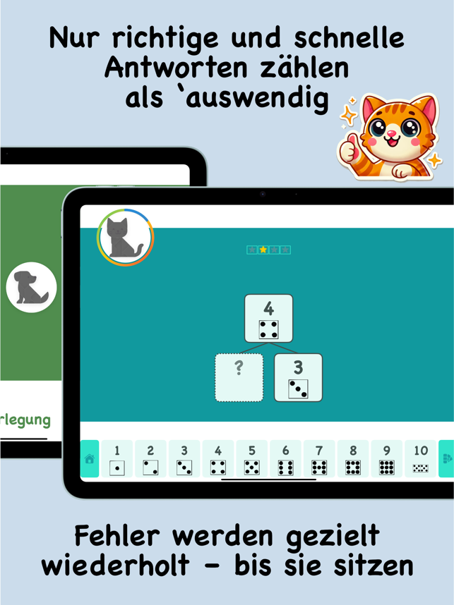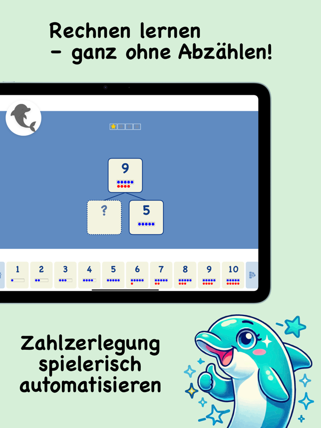 许多孩子通过数数来学习算术,但这种方法既费力,又常常导致今后的学习困难。本应用从数量与数字对应关系之后的阶段切入:专注于10以内数字分解的自动化。