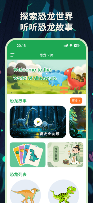 恐龙卡片,带你走进恐龙世界,探索恐龙认识恐龙!原创恐龙故事+角色配音,拟人化设计,生动趣味故事情节,让孩子化身小探险家,在三角龙成长、翼龙探险、霸王龙成长等故事中收获勇气与知识。