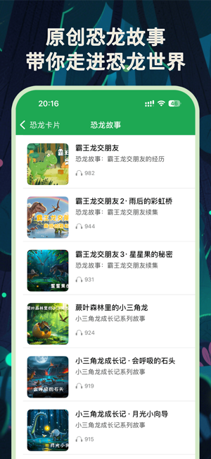 原创恐龙故事+角色配音,拟人化设计,生动趣味故事情节,让孩子化身小探险家,在三角龙成长、翼龙探险、霸王龙成长等故事中收获勇气与知识。