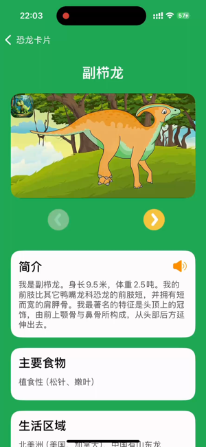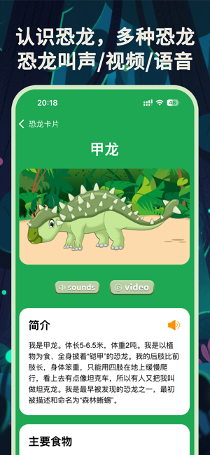 多种恐龙介绍,通过恐龙文字介绍、恐龙语音介绍、恐龙叫声、恐龙视频等多种方式展现恐龙,带小朋友认识恐龙。了解恐龙的时代、特征、分布地区、主要食物等。涵盖霸王龙、三角龙、剑龙、翼龙、副栉龙、甲龙、腕龙、雷龙、厚头龙、长棘龙(异齿龙)、棘背龙、超龙、鱼龙、双冠龙等恐龙。