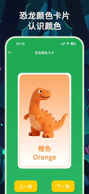 通过不同颜色的恐龙卡通形象卡片的形式,教小朋友颜色认知。