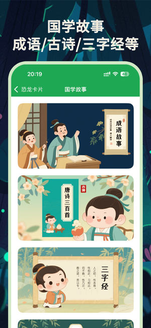 除恐龙故事以外,还提供了国学经典故事:成语寓言故事、需背记的古诗词、三字经、弟子规、百家姓、千字文等,后续还会新增更多类别。