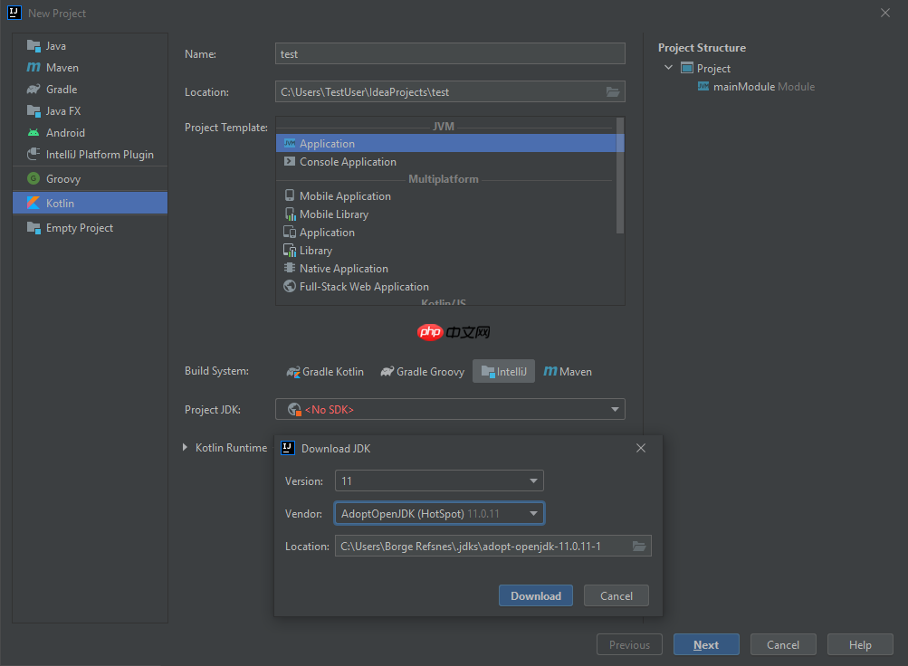 接下来,我们需要安装 JDK(Java 开发工具包)来启动和运行我们的 Kotlin 项目。单击 "Project JDK" 菜单,选择 "Download JDK" 并选择版本和供应商(例如 AdoptOpenJDK 11),然后单击 "Download" 按钮: