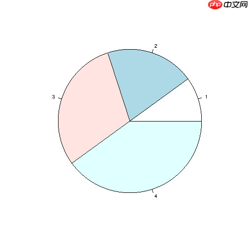 # 创建饼图向量 x <- c(10,20,30,40) # 显示饼图并从 90 度开始绘制第一个饼 pie(x, init.angle = 90)