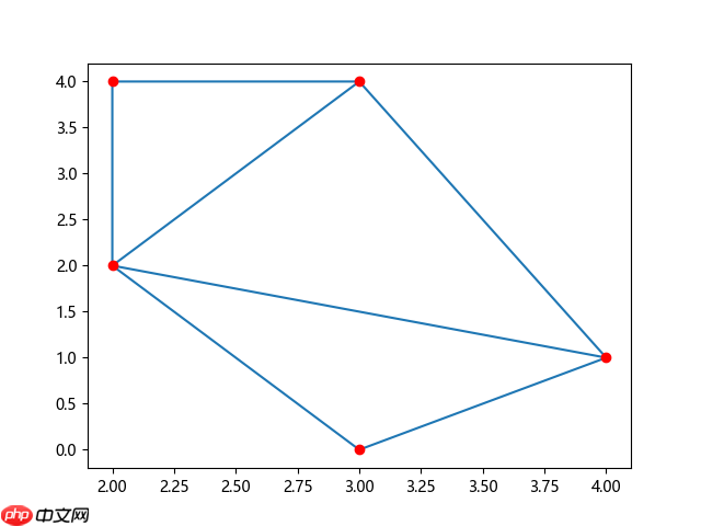 import numpy as np from scipy.spatial import Delaunay import matplotlib.pyplot as plt points = np.array([ [2, 4], [3, 4], [3, 0], [2, 2], [4, 1] ]) simplices = Delaunay(points).simplices plt.triplot(points[:, 0], points[:, 1], simplices) plt.scatter(points[:, 0], points[:, 1], color='r') plt.show()