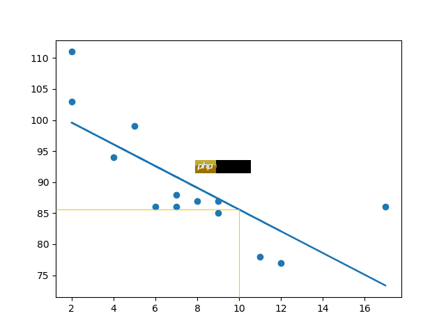 from scipy import stats x = [5,7,8,7,2,17,2,9,4,11,12,9,6] y = [99,86,87,88,111,86,103,87,94,78,77,85,86] slope, intercept, r, p, std_err = stats.linregress(x, y) def myfunc(x): return slope * x + intercept speed = myfunc(10) print(speed)
