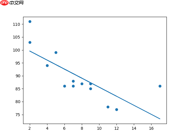 import matplotlib.pyplot as plt from scipy import stats x = [5,7,8,7,2,17,2,9,4,11,12,9,6] y = [99,86,87,88,111,86,103,87,94,78,77,85,86] slope, intercept, r, p, std_err = stats.linregress(x, y) def myfunc(x): return slope * x + intercept mymodel = list(map(myfunc, x)) plt.scatter(x, y) plt.plot(x, mymodel) plt.show()