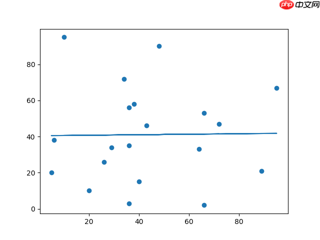 import matplotlib.pyplot as plt from scipy import stats x = [89,43,36,36,95,10,66,34,38,20,26,29,48,64,6,5,36,66,72,40] y = [21,46,3,35,67,95,53,72,58,10,26,34,90,33,38,20,56,2,47,15] slope, intercept, r, p, std_err = stats.linregress(x, y) def myfunc(x): return slope * x + intercept mymodel = list(map(myfunc, x)) plt.scatter(x, y) plt.plot(x, mymodel) plt.show()