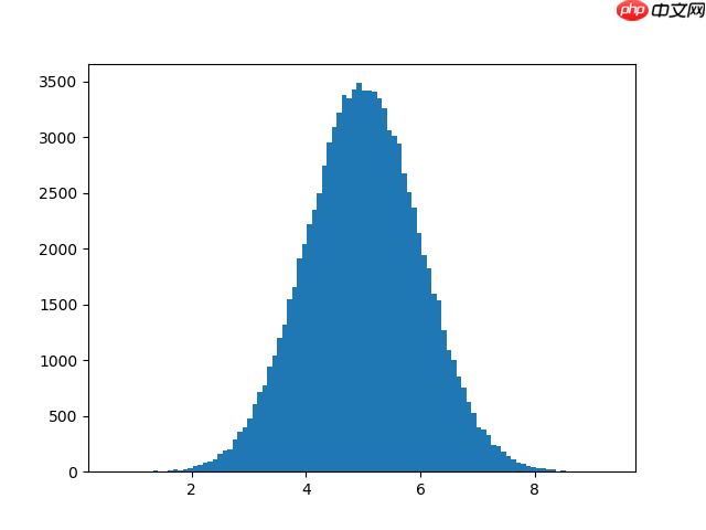 import numpy import matplotlib.pyplot as plt x = numpy.random.normal(5.0, 1.0, 100000) plt.hist(x, 100) plt.show()