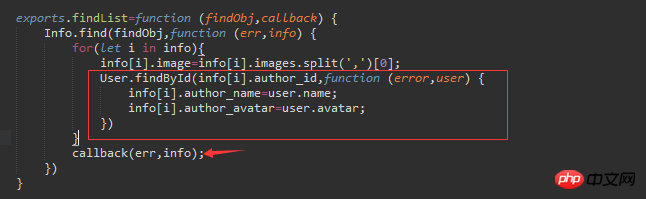 exports.findList=function (findObj,callback) { Info.find(findObj,function (err,info) { for(let i in info){ info[i].image=info[i].images.split(',')[0]; User.findById(info[i].author_id,function (error,user) { info[i].author_name=user.name; info[i].author_avatar=user.avatar; if(i==info.length-1){ callback(err,info); } }) } }) }