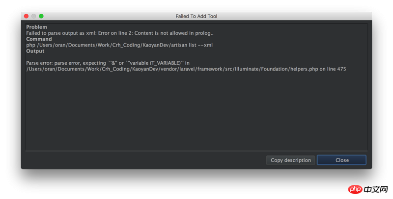 php artisan list --xml这个命令,而--xml是不被支持的,应该是php artisan list --format=xml可能这个参数不是你写的,看你的截图有选择 Symfony 的地方,应该是 PHPStorm 自动调用了