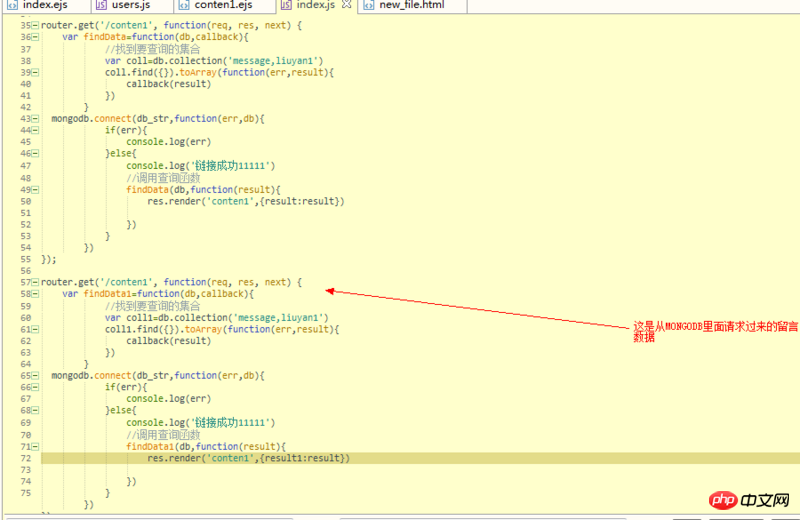 let data = {}; router.get('/', function (req, res, next) { data = {}; //模拟DB查询回调 setTimeout(function () { data.user = {id: 1, username: 'zhaojunlike'}; //传递到下面 next(); }, 1000); }); router.get('/', function (req, res, next) { console.log(data); //模拟第二次查询并且输出Render setTimeout(function () { data.content = {email: 'zhaojunlike@gmail.com'}; res.render('index', {title: 'Express', data: data}); }, 1000); });