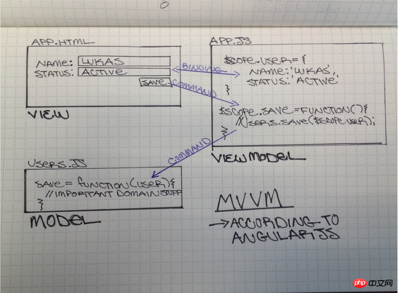 想好说清楚,最好就是使用用例来解释MVVM是如何工作的,下图以AngularJS为例。