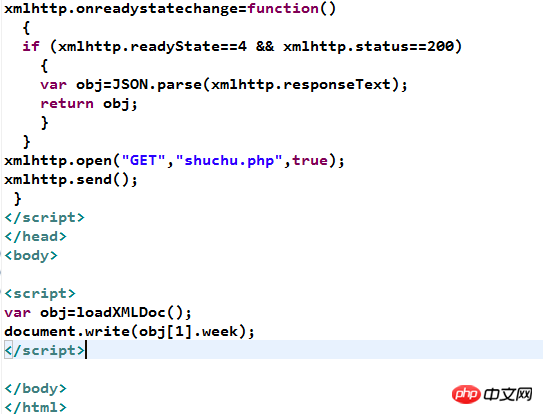 function loadXMLDoc(callback) { callback = callback || function() {}; ...... //这里是xmlhttp的一些定义 xmlhttp.onreadystatechange = function() { if(xmlhttp.readyState == 4 && xmlhttp.status == 200) callback(JSON.parse(xmlhttp.responseText)); } ...... //这里是xmlhttp的其它操作 } loadXMLDoc(function(res){ document.write(res[1].week); });