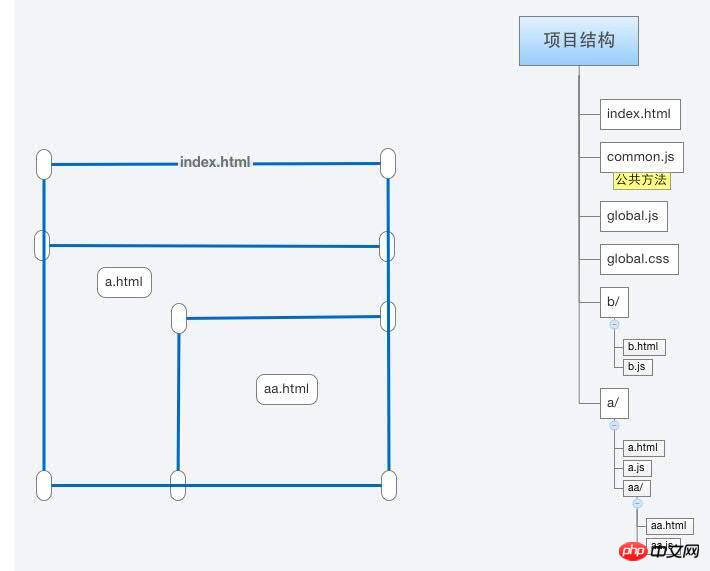 基本就是在'上一层'父页面点击导航按钮后,在父页面局部加载对应子页面;然后子页面上点击导航按钮,在子页面局部加载对应子子页面;不断循环下去。。。以文件夹的形式保持项目的结构性。