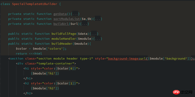 比如你的buildHeader方法返回了一段html,页面中这样用: echo specialTemplate01Builder::buildHeader($module);