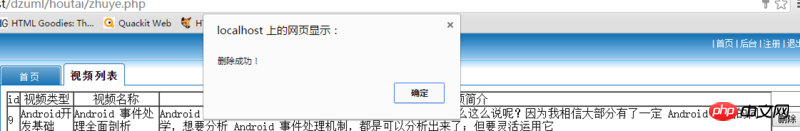 php<table border="1px" cellpadding="0" cellspacing="0"> <tr align="center"> <td>id</td> <td>视频类型</td> <td>视频名称</td> <td>视频简介</td> </tr> <?php $sql = mysql_query("SELECT * FROM wjyl_content1 "); while($row=mysql_fetch_array($sql)){ ?> <tr> <td><?php echo @$row[content_id]?></td> <td><?php echo @$row[content_leixing]?></td> <td><?php echo @$row[content_title]?></td> <td><?php echo @$row[content_comment]?></td> <td> <form action="#" method="get" name="form"> <input type="submit" value="删除" name="submit"> <?php $id=@$row['content_id']; if(@$_GET['submit']){ $sql=mysql_query("DELETE FROM wjyl_content1 WHERE `content_id`='$id'"); if($sql){ echo "<script>alert('删除成功!');history.back();</script>"; }else{ echo "<script>alert('删除失败!!');history.back();</script>"; } } ?> </form> </td> </tr> <?php } ?> </table>
