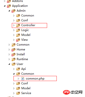 这个是我的目录树,我想在模块Admin中的Controller中的一个action中调用另一个模块User中的公共方法common.php中的一个函数,请问应该怎么写?