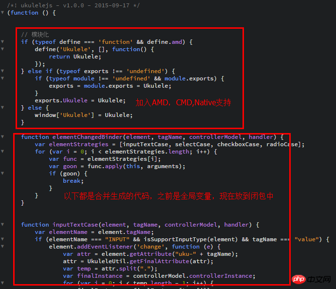 由于最终生成的合并代码都是全局变量和函数,我需要在最终合并的代码上加上闭包和AMD,CMD的支持