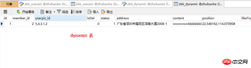 有两张表,userpic表是图片上传的表,dynamic表是用户发布的动态列表,dynamic里面的userpic_id字段的各个值对应userpic表的id