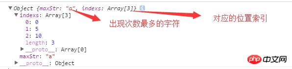 function getMaxAndIndex( arr ){ var obj = {}; arr.forEach(function(item,index){ if(!obj[item]){ obj[item]= {indexs: [index]} }else{ obj[item]['indexs'].push(index); } }); var num=0;//记录出现次数最大值 var str='';//记录出现次数最多的字符 var reArr;//返回最大值的位置数组 for(var attr in obj){ var temp=obj[attr]['indexs']; if(temp.length>num){ num=temp.length; str=attr; reArr=temp; } } return { maxStr:str, indexs:reArr } }