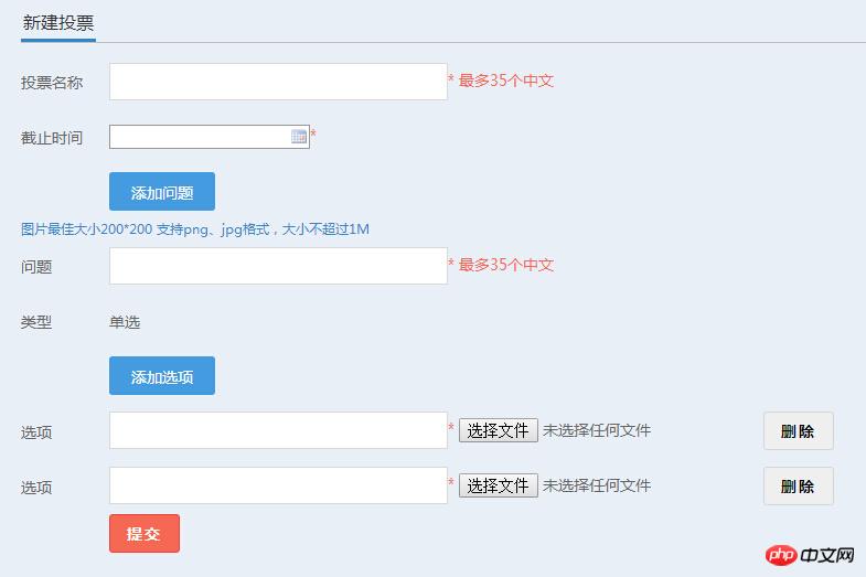 可以动态添加多个问题,每个问题下面默认有两个选项,也可动态添加多个。已经通过JS实现动态添加功能,但在PHP中无法获取到问题选项的值,单个选项的html如下