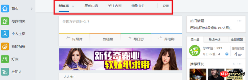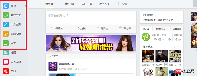 1.点击左边侧边栏上的菜单时,会跳转到相应的页面,而且用户明显感到整个页面有刷新,相应菜单项的链接地址是以http形式写的,如“与我相关”这个菜单项的链接地址是http://matter.renren.com/