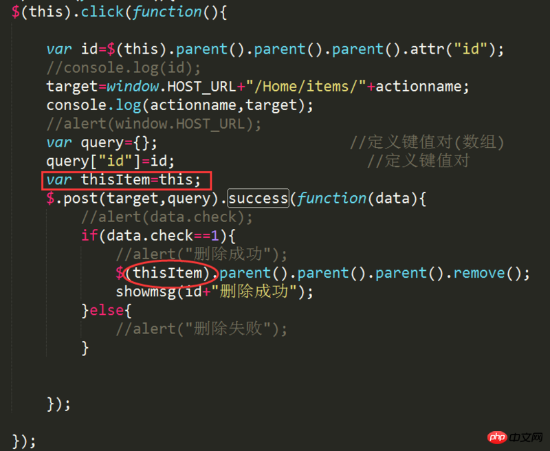 变量作用域的问题,第一个之所以可以,是因为success里的匿名函数写在click里面,所以这个匿名函数的父作用域中有thisItem这个局部变量,而后面那个之所以不行,是因为success的回调函数定义在了click外,自然不能访问到click里的变量了。