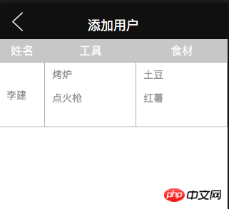 一个用户对应的分配任务,可以是多个的,如准备工具烤炉、点火枪,购买土豆、红薯等,填好姓名,选好工具或食材,点左上角的返回,上图的主界面就多了一个用户