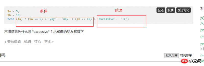 ($a) ? ($a == 5) ? 'yay' : 'nay' : ($b == 10) ? 'excessive' : ':('; 这种写法你是从左往右读的,但机器不这么读,它可能是这样读的 ($a) ? (($a == 5) ? 'yay' : 'nay' : ($b == 10) ? 'excessive') : ':('; 电脑头都晕了