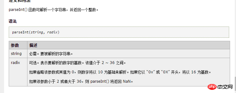 parseInt这个方法,这个方法是可以接受两个参数的,第一个就是要你要解析成整数的字符串,第二个参数则是指定转换中采用的基数(可忽略)。然后这段代码: