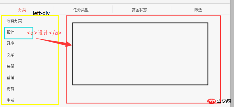 黄框中的分类信息是页面加载时获取数据并添加到.left-p中的(.left-p里都是都是display:block的a标签),然后需要实现点击a标签,获取a分类的详细分类显示到红框的right-p中列表显示!