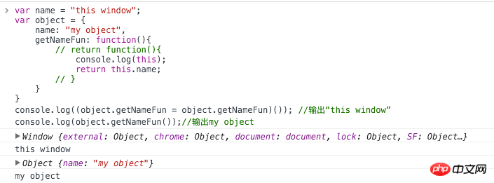 (object.getNameFun = object.getNameFun)()是何意?为什么会输出this window?object.getNameFun = object.getNameFun这条表达式将object.getNameFun赋值给自身,结果是输出了一个匿名函数:function () { return this.name; },而