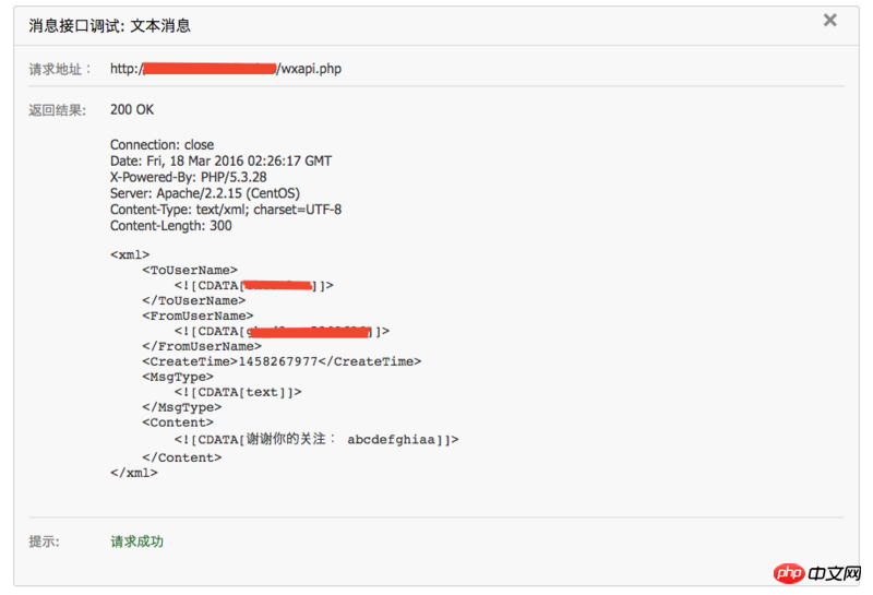 想要测试“被动回复用户消息”的接口时,在微信公众平台接口调试工具中可以正确返回消息,如下图: