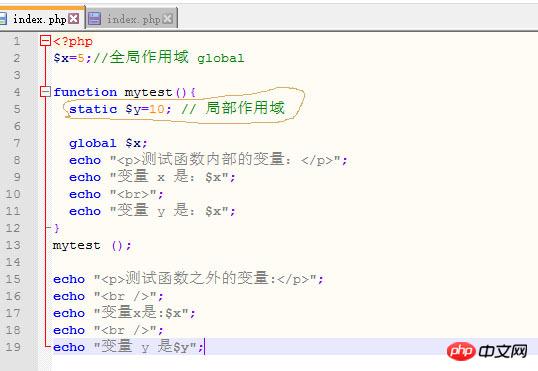 有两种方法 一个是加 global 关键字,global $y; $y =10; 第二个是放在超全局数组$GLOBALS中,如$GLOBALS['y'] =10