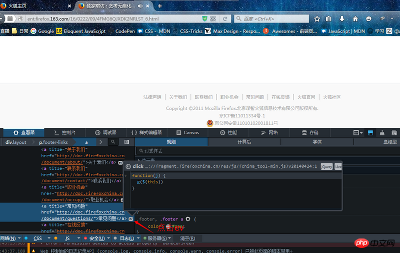 Elements > Event Listeners中可以查看元素上绑定的事件,并能链接到具体的JS代码。用Firefox浏览器!!!自带的调试工具,不是firebug。如图: